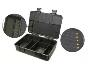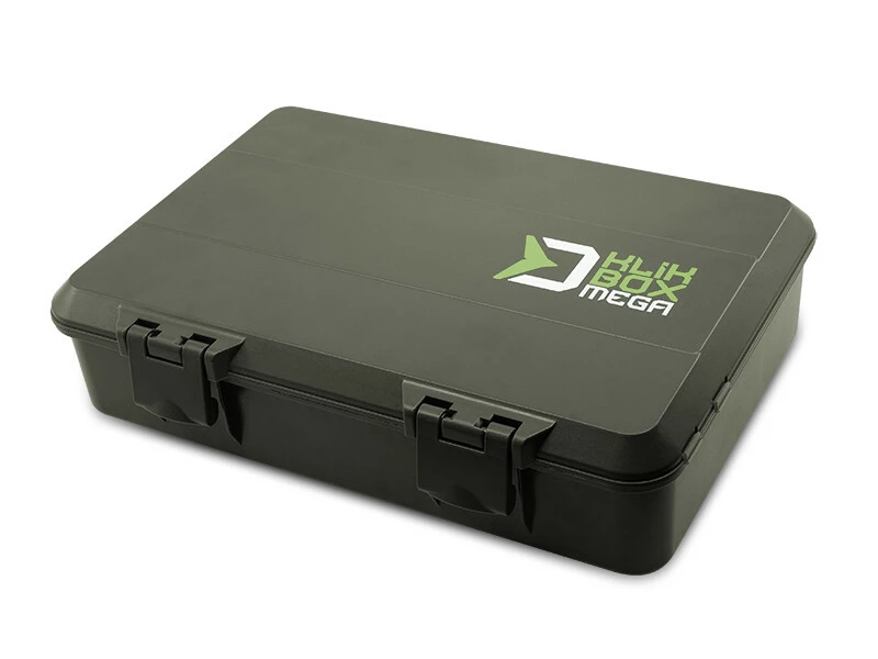Ve spodní části boxu se nacházejí přihrádky, disponující vyjímatelnými přepážkami, čímž lze tento prostor přizpůsobit vašim požadavkům. Na vrchní straně je několik průhledných, uzavíratelných přihrádek různých rozměrů, které poskytují ideální prostor pro uložení drobné bižuterie. Díky jejich průhlednému provedení, budete mít vždy přehled o tom co se uvnitř nachází a potřebnou komponentu tak najdete během mrknutí oka. Kromě toho se na vrchní straně nachází také plato z tvrzené pěny a špendlíky, což umožňuje uchycení koncových montáží. KlikBOX Mega vám tak umožní sbalit vše potřebné k lovu, abyste byli vždy dokonale připraveni. K uzavření organizéru poslouží masivní klipy, které se postarají o to, aby vše zůstalo na svém místě.