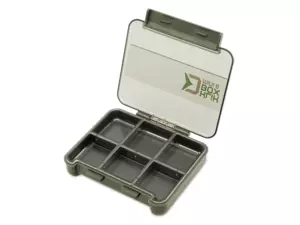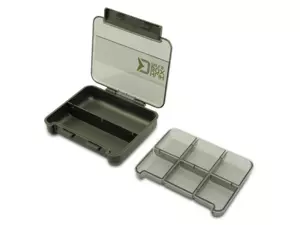 Uvnitř se nacházejí dvě pevné přihrádky podlouhlého tvaru, vhodné například na gumičky proti zamotání či smršťovací bužírky. Velkou výhodou je vyjímatelná část s dalšími šesti přihrádkami, které se dokonale hodí pro uložení obratlíků, háčků, rovnátek a jiných prvků určených pro přípravu koncové montáže.