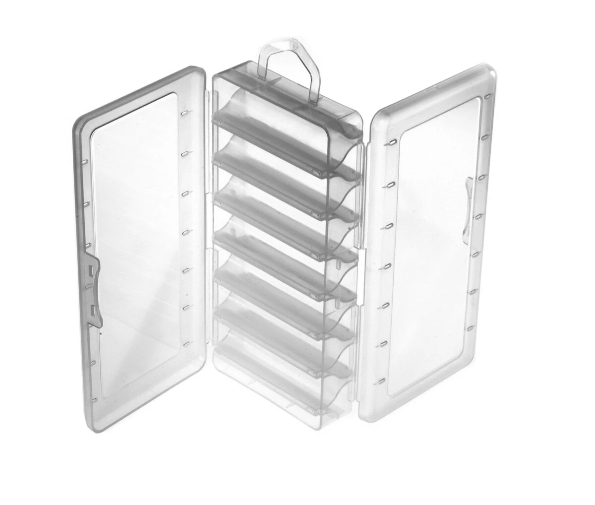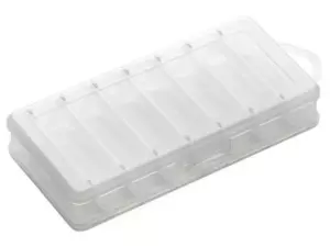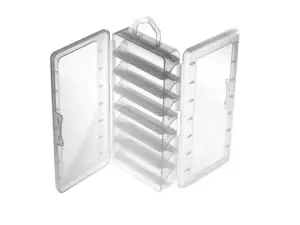Základní oboustranná uzavíratelná krabička / boxík od značky Plastilys. Tuto krabičku využijete především pro uskladnění a přenos nástrah na dravce, jako jsou gumové rybky a twistery, třpytky nebo samozřejmě woblery. Krabička disponuje 7-mi přihrádkami z obou stran, takže pojme minimálně 14 ks nástrah o maximální délce šířky boxu tzn. cca 9,5 cm.