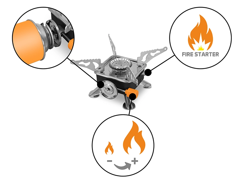 Vařič je kompatibilní s butanovými kartušemi o hmotnosti 220g (400ml) s rychloupínacím ventilem, které jsou vyrobeny v souladu s normou EN4117. Stačí přitlačit ventil kartuše k upínacímu mechanismu na vařiči ve správné pozici, mírně ji pootočit a sestava je připravena k použití. Je vybaven otočnou regulací průtoku plynu a piezoelektrickým zapalováním, díky kterému nebudete potřebovat zápalky ani zapalovač.