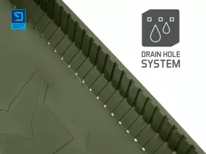 ShelfPOD má vyvýšené okraje, díky kterým zůstanou uložené předměty na svém místě. Dno je perforované a umožňuje vytečení přebytečné vody po dešti. Dva pevné plastové háky umožňují snadné a rychlé zavěšení na stojan a jelikož jsou odnímatelné, je možné si poličku přenést do bivaku nebo na stolek.