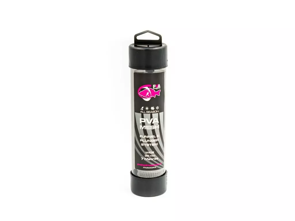 Prvotřídní PVA punčocha včetně tubusu a pěchovače. Evropský výrobce PVA produktů společnost PVA Hydrospol Vám přináší klasický systém 35 mm s micro-mesh síťkou. Všechny naše punčochy jsou pletené z kvalitních japonských vláken formou hustého micro-meshe. Průměr 35 mm je vytvořen z 36 PVA vláken. Naše punčochy můžete plnit sypkými materiály nebo drobnými peletami, aniž by vám zvolená směs propadávala úpletem punčochy. Čas rozpustnosti závisí na teplotě vody. V teplé vodě se doba rozpadu pohybuje okolo 45 sekund, naopak v ledové vodě to může být až 8 minut. Veškerý náš PVA program je vhodný pro celoroční použití.