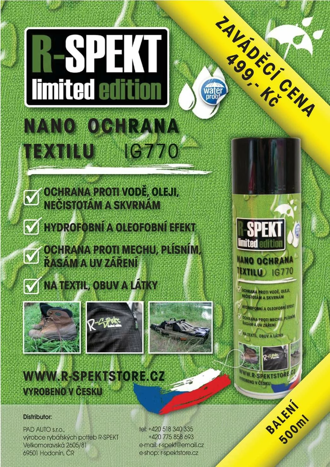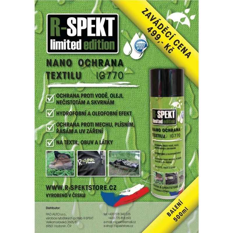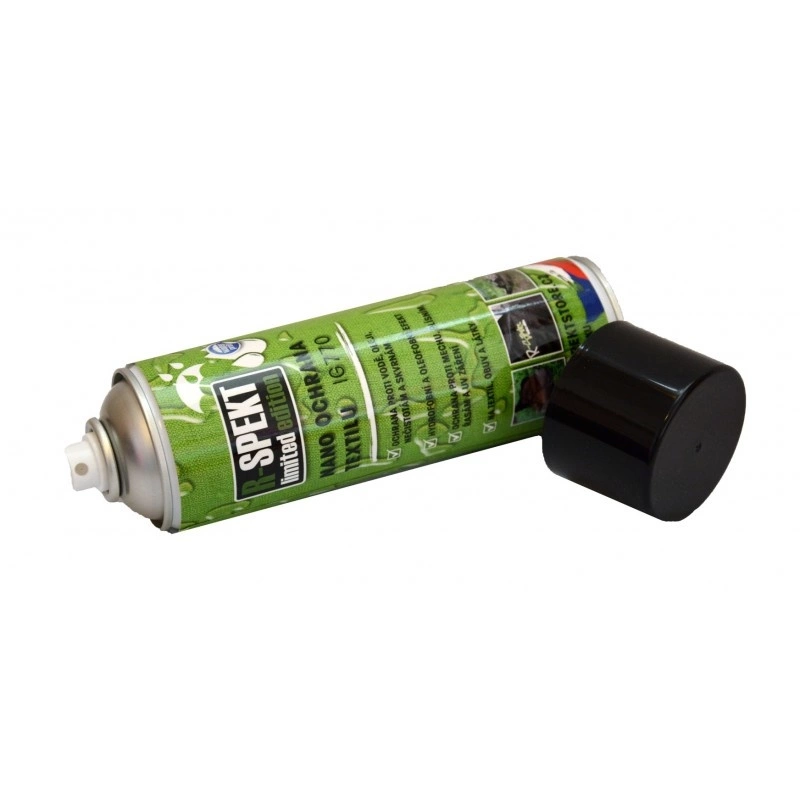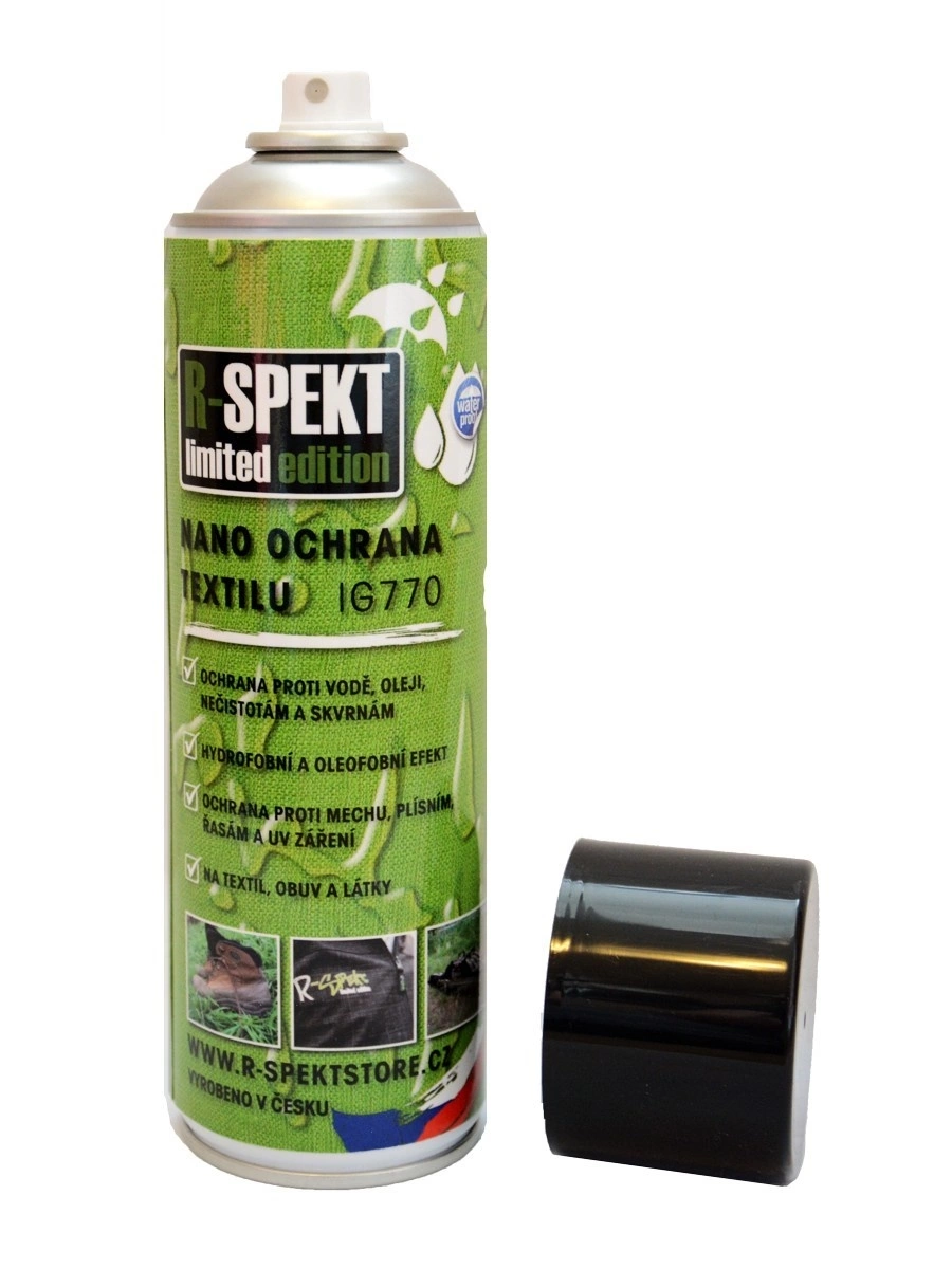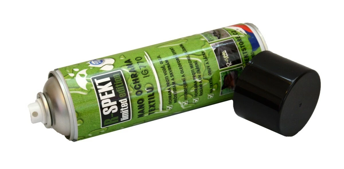 R-SPEKT NANO ochrana textilu je specificky vyvinutá hydrofobní/oleofobní ochrana tkané a netkané textilie, koberců, veškerých textilních vláken apod. Na bázi fluoropolymerů vytvoří na povrchu ultratenkou hydrofobní neviditelnou NANOvrstvu s vynikající ochranou proti znečištění, skvrnám, suchým nečistotám, vodě, oleji, mastnotě a agresivním nečistotám se samočistícím účinkem. Vytvořená NANOvrstva znemožňuje život bakteriím, mechu, plísním a řasám, vytváří velmi hygienický povrch. Chrání i proti atmosférickým vlivům počasí (dešti, sněhu, mrazu, a rozmrazovacím solím), žloutnutí, hnilobě a UV záření.