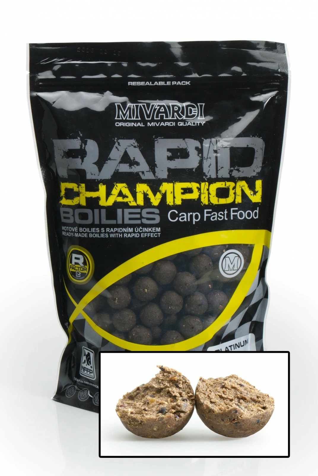 Jestliže hledáte nástrahu bez kompromisů, zvolte Rapid Champion Platinum. Jsou v něm použity nejlepší dostupné ingredience. Je předurčeno k lovu těch nejmazanějších kaprů, kteří se naučili rozlišovat kvalitu od kvantity. Maximální množství sypkých složek je před výrobou extrudováno. Toto boilies obsahuje velké množství kvalitních tekutých potrav včetně nových vynikajících esencí "Made in UK" a esenciálních olejů. Použití R-FACTORu zajišťuje dokonalou stabilizaci a mimořádně šetrnou konzervaci. Optimální konzistence a tvrdost umožňuje velkou výdrž po nastražení (až 24hod). Vysušením lze dále zvýšit jeho výdrž a odolnost vůči bílým rybám.
