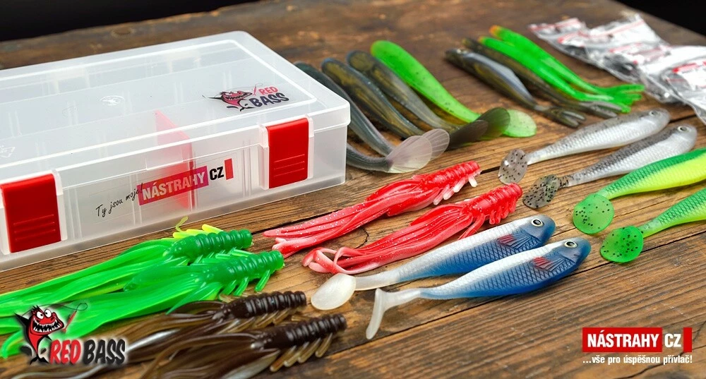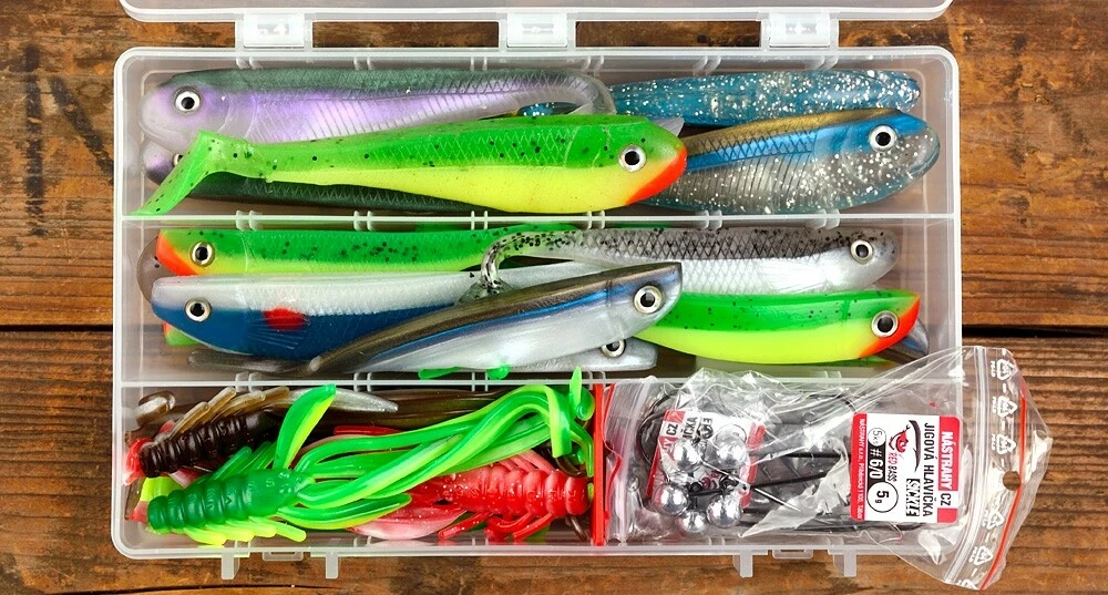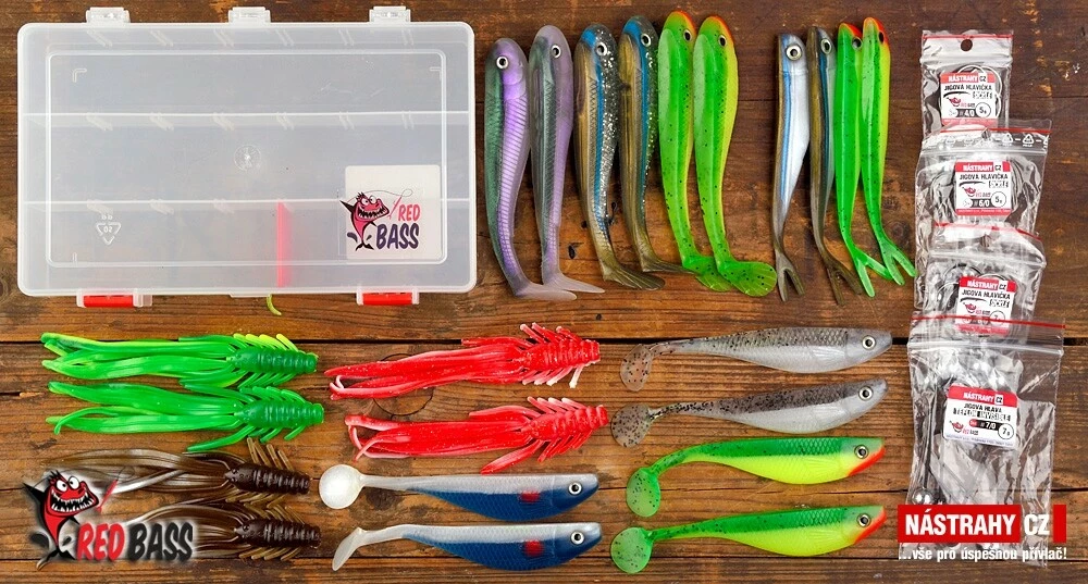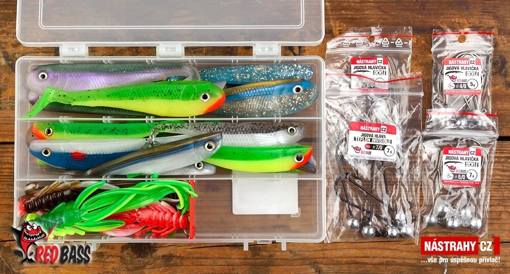 Pečlivě vybraná sada osvědčených nástrah pro lov štik a k nim odpovídající jigové hlavičky vč. krabičky.