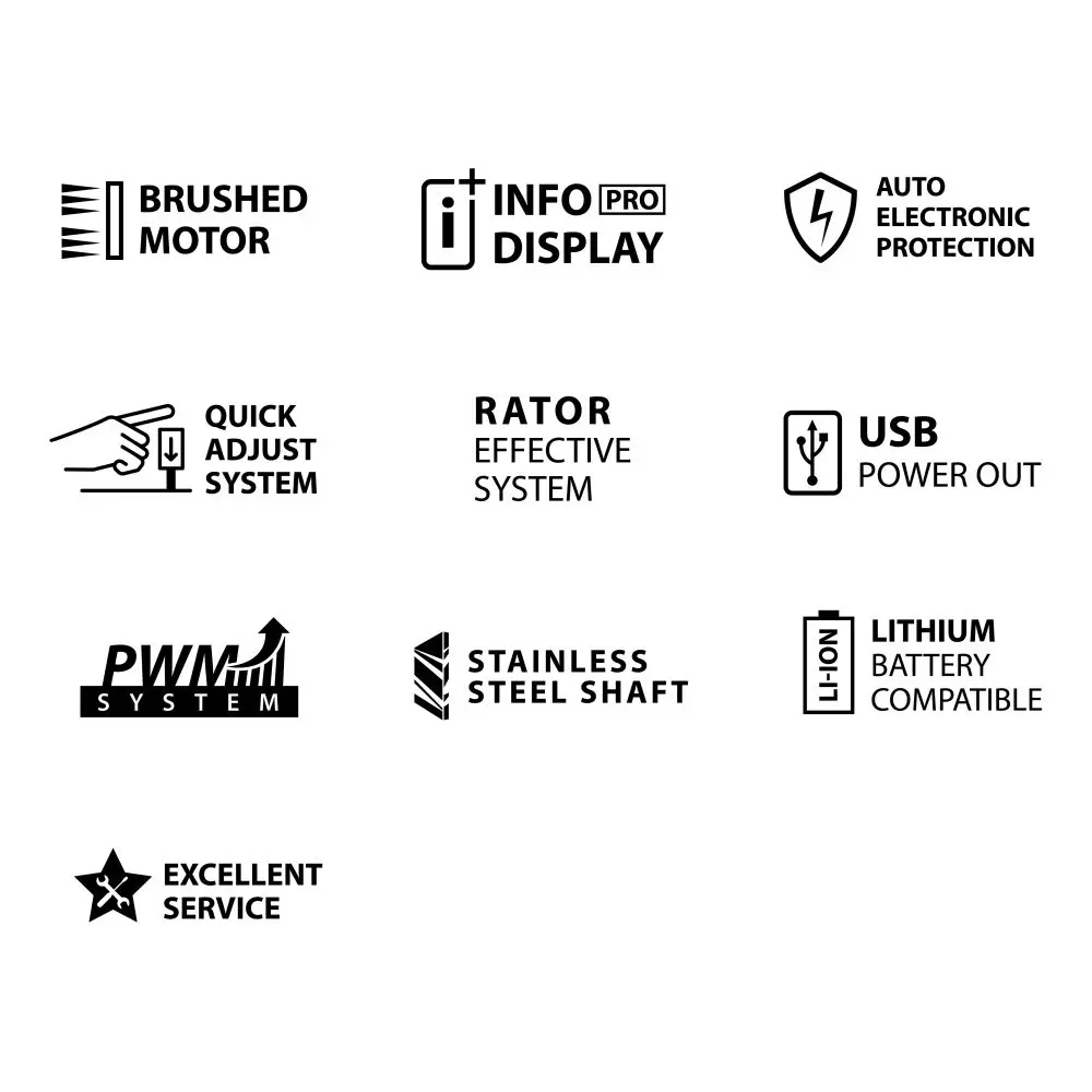 - PWM System: Široká pulzová modulace (PWM) pro efektivní bezestupňové ovládání otáček.