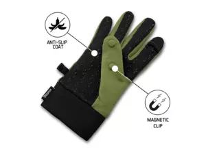 Samotná tkanina je z vrchní strany hladká a flexibilní, ze spodní strany má pogumování ve tvaru magnetů zlepšující uchopení a protiskluzové vlastnosti rukavic. Vnitřní fleecová vrstva je měkká a hřejivá, což zaručuje skvělý komfort během zimního lovu ryb.