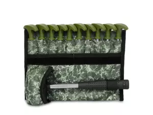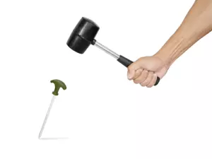 Set obsahující 10 pevných, kovových kolíků s kladivem v praktickém pouzdru s C2G designem.