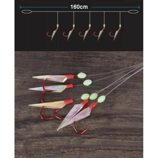 Návazcová souprava pro lov sleďů s pěti červenými háčky. Jedná se o imitaci rybí kůže.