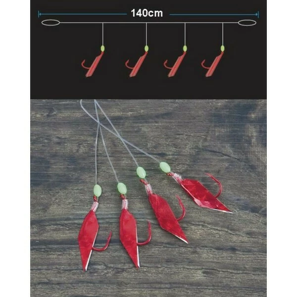 Extra silný návazec se čtyřmi červenými háčky a imitací rybí kůže.