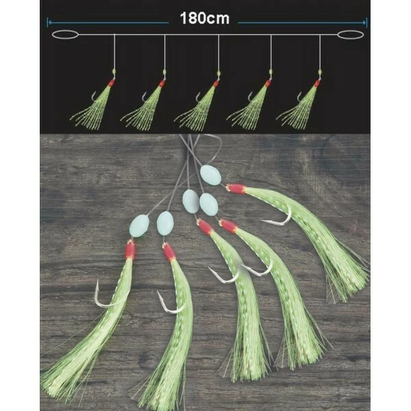 Systém pro lov makrel s pěti háčky. Nad háčkem jsou fluorescenční korálky a na háčku jsou zelené střapce. Součástí balení je EVA Board - pěnová deska na návazce.