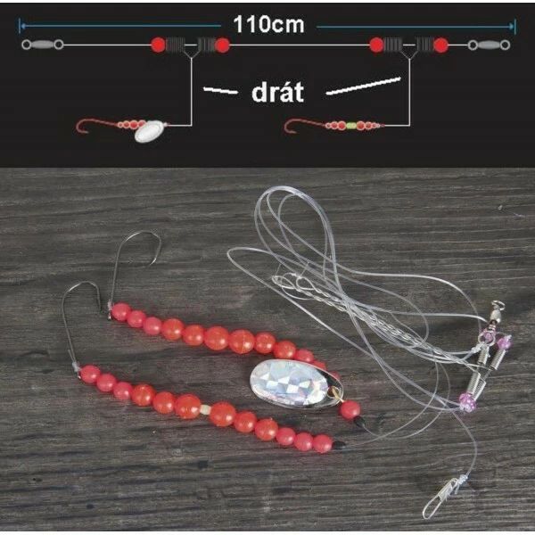 Hlavní vlasec je osazen dvěma háčky, jsou umístěny na ocelovém rameni, které dovoluje nástraze rotovat okolo vlasce bez zamotání. Systém je vybaven několika bílými korálky a třpytkou. Je neodolatelný pro všechny druhy platýsů. Součástí balení je EVA Board - pěnová deska na návazce.