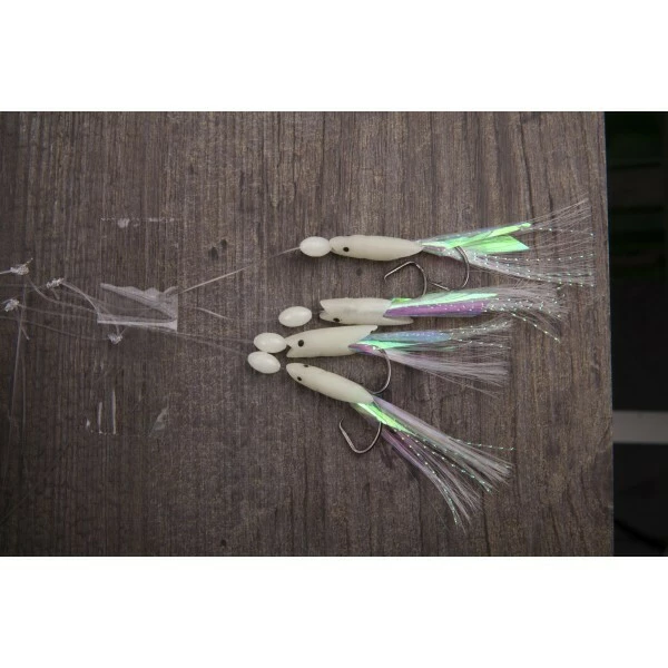 Systém pro lov makrel se čtyřmi háčky. Nad háčkem jsou bílé korálky a na háčku je bílá imitace rybí hlavičky a fluorescenční folie s bílými střapci.