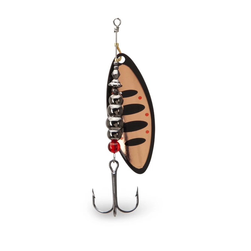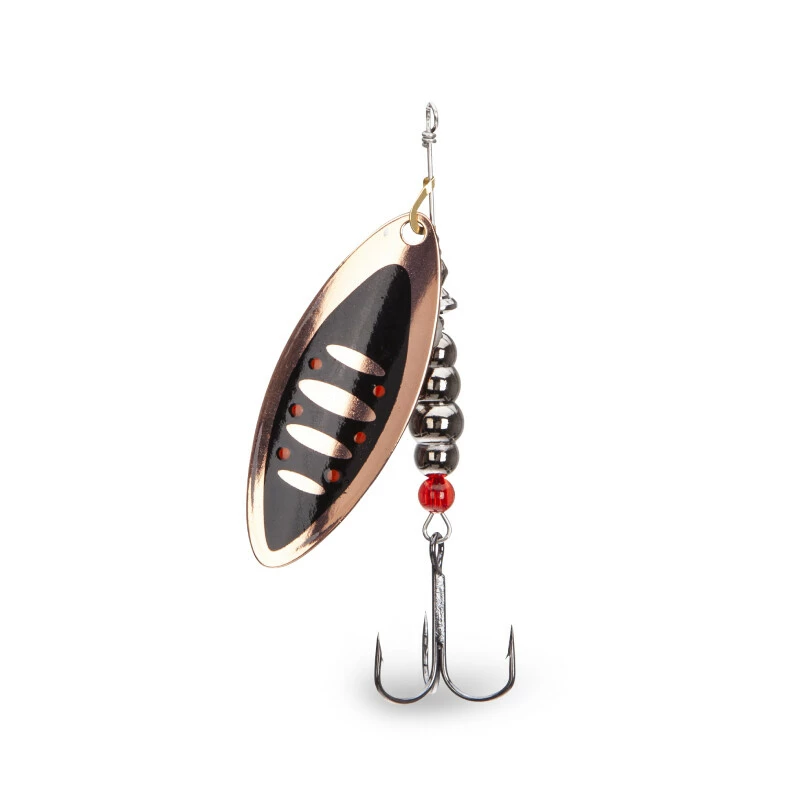 Klasická rotační třpytka s podlouhlým listem. Je vyrobena z kvalitního materiálu a doplněna kvalitními komponenty. Je osazena háčky Mustad. Lopatka má z každé strany jiný design.