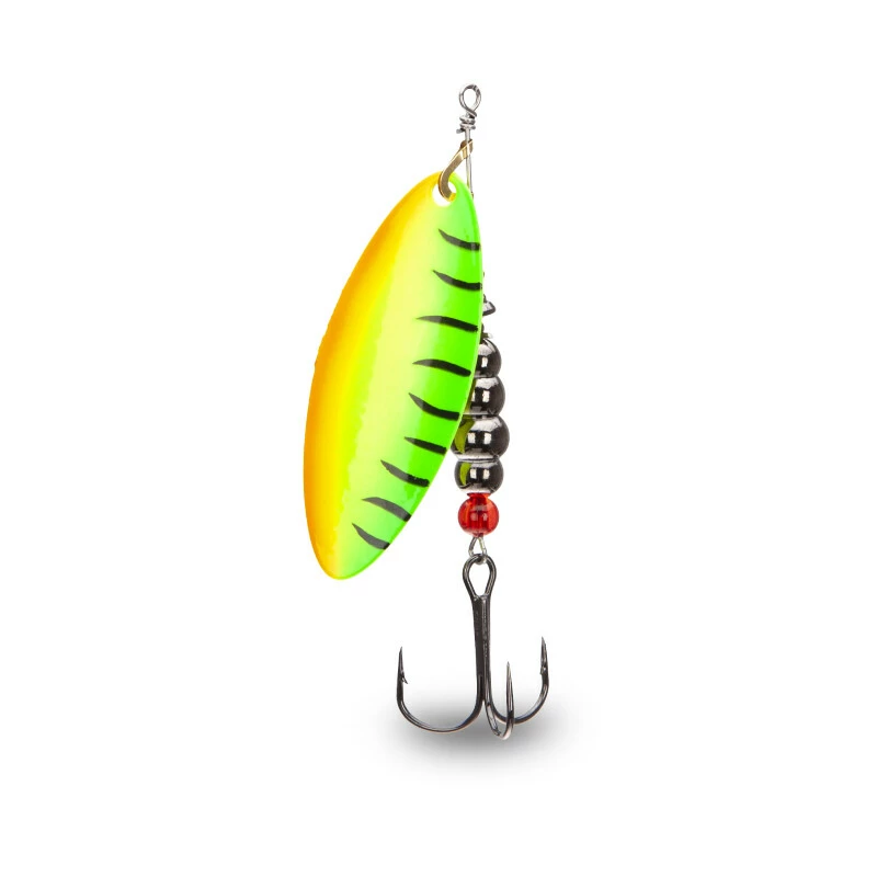 Klasická rotační třpytka s podlouhlým listem. Je vyrobena z kvalitního materiálu a doplněna kvalitními komponenty. Je osazena háčky Mustad. Lopatka má z každé strany jiný design.