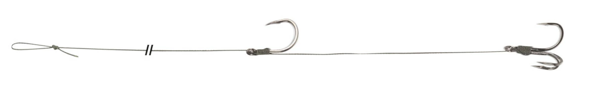 Při použití větších nástrah lze použít variantu jednoháčku s trojháčkem. Trojháček Joker společně s New Age S-Hook navázaný na Vencata Leader.