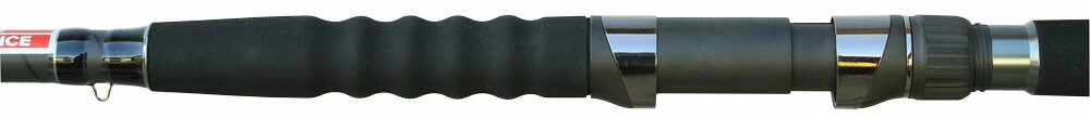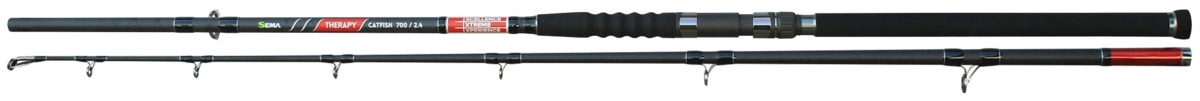 "Therapy Catfish - sumcový speciál disponující dostatečnými parametry pro zdolání těch největších ryb. Dvoudílný prut vyrobený z kvalitního kompozitního materiálu. Je vybaven rukojetí z materiálu EVA, kvalitními očky, přesnou trnovou spojkou a další pomocnou protiskluzovou rukojetí nad sedlem navijáku. Tato pomocná rukojeť umožňuje jistější držení prutu během zdolávání. Očka prutu jsou hustě rozmístěna tak, aby bylo možné prut použít v kombinaci s multiplikátorem umístěným nad prutem. Therapy Catfish je vyráběn v délkách 240 cm a 270 cm se zátěžemi 500 g nebo 700 g. Délka 240 cm je vhodnější pro lov sumců z lodě pomocí vábničky, délka 270 cm je zase vhodnější pro lov sumců ze břehu pomocí trhacích bójí nebo podvodního splávku. Tento prut vykazuje – zejména ve variantě 700 g - brutální bojovou sílu při téměř parabolické akci. Přesto, že tento prut je určen prvořadě pro lov sumců, jistě svými parametry uspokojí i specialisty na mořský rybolov. Velmi velké síle při zachování parabolické akce, houževnatosti a odolnosti tohoto prutu jsme dosáhli použitím kompozitního materiálu, který je složený z uhlíkových a sklolaminátových vláken. Uhlíková vlákna s vysokým modulem pružnosti (UHM - Ultra High Modulus) dávají prutu velkou sílu a rychlou reakci a sklolaminátová zase vysokou pevnost a odolnost. Kombinace těchto dvou materiálů je ideální pro extrémně namáhané pruty používané při lovu velkých ryb." Prut má 8x očko