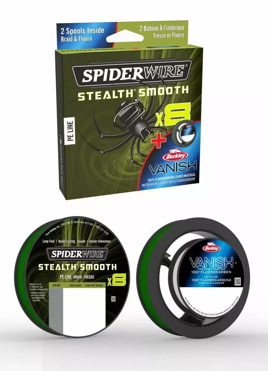 DUO Spool je nový koncept od značky SpiderWire. O co vlastně tady jde. Jedná se o pomoc rybáři vyřešit otázku, jaký použít správný šokový vlasec nebo flurocarbon na kmenovou šňůru, tak aby byl správný poměr síly a velikosti kmenové šňůry a šokového vlasce nebo fluorocarbonu. Proto v balení naleznete jedno klubíčko osmi vláknové kmenové šňůry SpiderWire Stealth Smooth8 Moss Green 150m a druhé klubíčko 100% fluorocarbonu Berkley Vanish Clear.