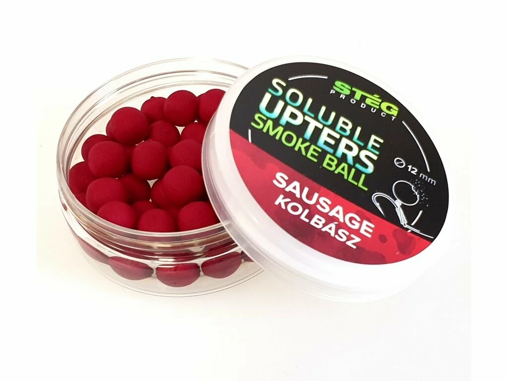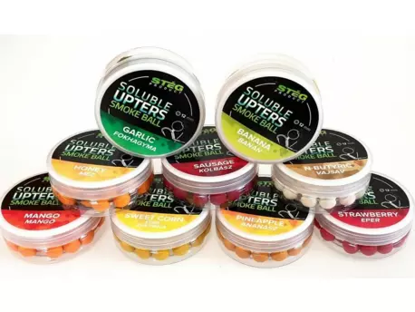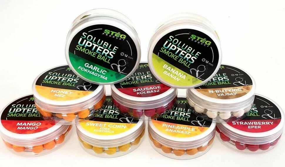 Novinka od maďarské společnosti STÉG - SOLUBLE UPTERS SMOKE BALL. Jsou rozpustné neutrálně vyvážené nástrahy ve velikosti 12mm. Nástrahy jsou dodávány v různých příchutích. Nástraha se postupně rozpouští a uvolňuje aroma a kouřový mrak, čímž neskutečně láká ryby.
