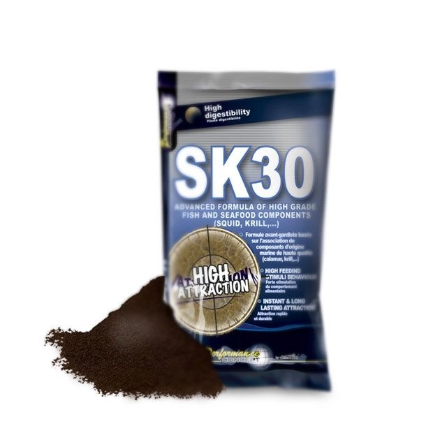 SK30 obsahuje pouze vybrané suroviny mající extrémně vysokou lákací schopnost (výtažek z olihně a planktonu, rybí moučku sušenou při nízké teplotě a rozpustné rybí proteiny). Unikátní skladba amino-kyselin amastných kyselin přitahuje zejména velké kapry. Speciální zesílený přírodní olej, známý svou stimulací rybích pachových orgánů napomáhásnadné lokalizaci nástrahy.