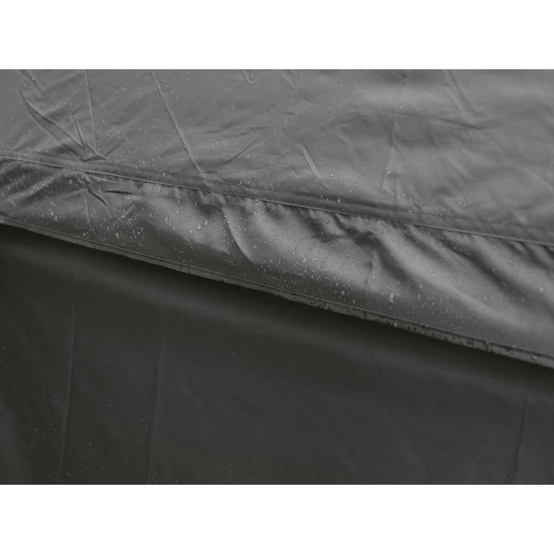Krytý půdorys 2,2x2,2m je díky použití čtyř zesílených sklolaminátových ramen přísně čtvercový, což umožňuje stoprocentní využití vnitřního prostoru. S odlehčeným rámem se lépe manipuluje a ulehčuje stavbu celého deštníku. Kryt zipu je umístěný pod ramena.