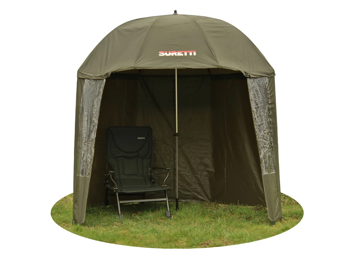 Rybářský deštník s bočnicí z 210D materiálu. Švy jsou podlepené, po obvodu vrchlíku jsou čtyři očka k ukotvení, deštník je dodáván se čtyřmi stavitelnými provazy a kolíky. Deštník lze naklápět. Žebra jsou z ocelových drátů 1,25m dlouhých o průměru 4,2mm, eloxovaných černou barvou. Středová tyč je teleskopická s novým, velmi spolehlivým adaptérem, který vnitřní trubku svírá po celém obvodě. Průměr rozloženého deštníku je 205cm, výška bočnice 130cm. Transportní délka je 1,4m, váha 4,8kg. Deštník je dodáván v přepravním obalu.