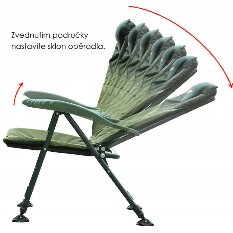 Pohodlné a exkluzivní rybářské křeslo s anatomicky tvarovanou matrací. Konstrukce křesla je ocelová o tloušťce stěny 2mm a velmi jednoduchá, pevná s nosností až 160kg, jeho rozložení či složení je otázkou několika vteřin. Opěradlo má pohodlný polštář a na bocích matrace je lem, chránící před větrem a zimou. Pevné područky slouží k naklápění opěradla při jejich nadzdvižení (8 poloh). Teleskopické nohy jsou vybaveny spolehlivou aretací a protiskluzovými packami proti zaboření. Výška sedáku 37 - 56 cm bude pro mnohé velkou výhodou, při častém vstávání k prutům.
