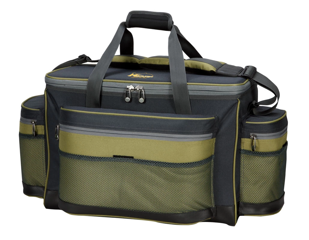 Velká kaprová taška z plastex materiálu. Má dvě velké boční kapsy a jednu velkou přední na drobnosti. Kvalitní zipy a popruh přes rameno.