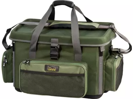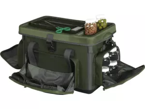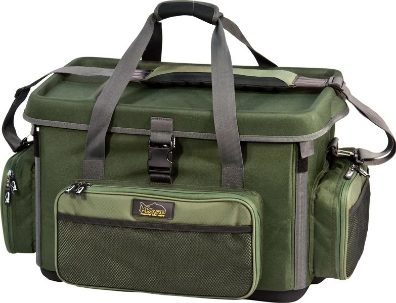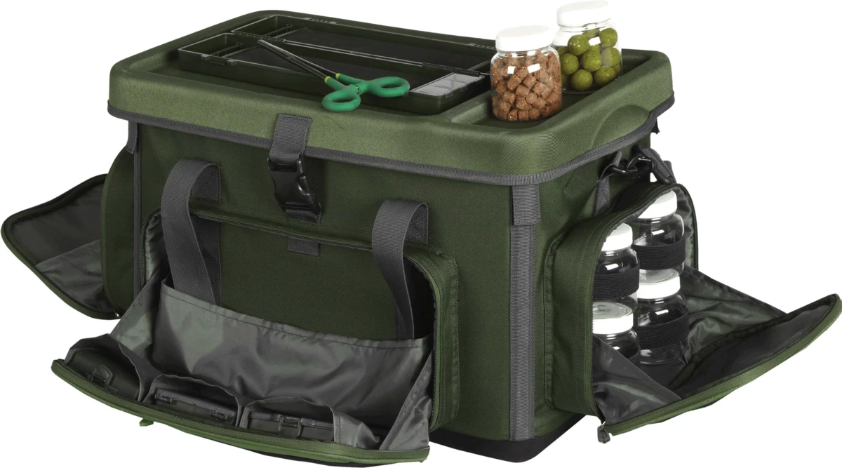 Luxusní kaprová nepromokavá taška s pevným stolkem a vystuženýma nohama. Pevný stolek můžete od tašky odejmout. Taška obsahuje tři plastové krabičky na příslušenství, plastový organizér na návazce a osm dipovacích doz na nástrahy. Tuto tašku využijeme při různých rybolovných technikách jako např. kaprařina nebo feeder. Rozměry 63x34x35cm.
