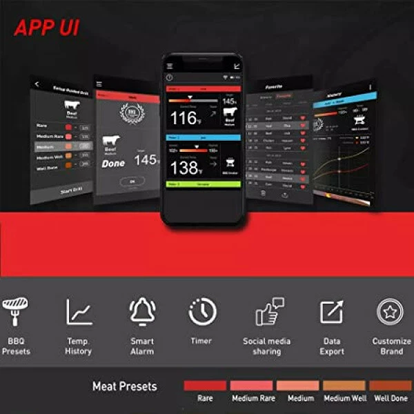Dosah sondy (vzdálenost bezdrátového připojení Bluetooth) je až 100 m na volném prostranství (při přímé viditelnosti na sondu). V uzavřeném prostředí (trouba, gril, udírna) je dosah až 15 m.