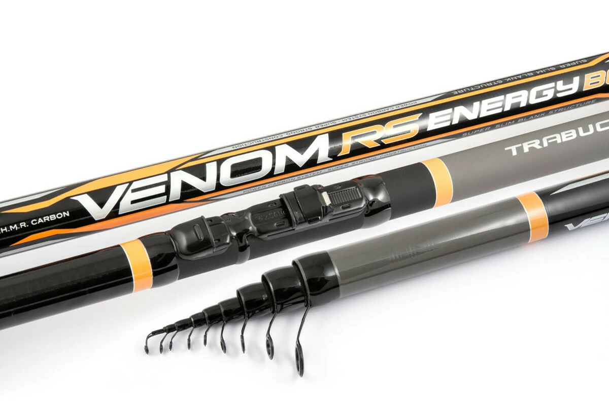 Firma Trabucco vždy ve svém produktovém portfoliu nabízí příležitost dostupných prutů pro začínající a rekreační rybáře, tak aby splnily přesně jejich požadavky. Venom RS nabízí šetrný kompromis kvality a aktraktivní ceny s ohledem na vysoce kvalitní materiály, jež jsou použity v jednotlivých konstrukčních částech. V samotném štíhlém blanku je použit odolný S.H.M.R carbon, který svou specifickou strukturou dodává blanku pevnost a zároveň lehkost. Osazení jednotlivých S-SiC oček je zpevněno prstencovou lamelou a jejich vnitřní keramické vyztužení je chrání proti mechanickému poškození. Celá tato modelová řada tak nabízí kvalitově nadstandartní pruty v návaznosti na jejich pořizovací cenu.