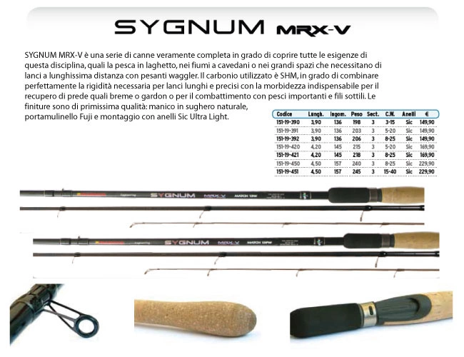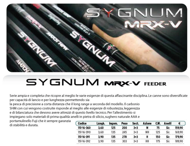 Pruty jsou lehké a skvěle vyvážené a mají dost síly i pro boj s většími rybami. Sygnum Mrx-V jsou dodávány s třemi uhlíkovými feederovými špičkami, které s prutu dělají jak lehký, tak těžší feeder. Technické údaje: