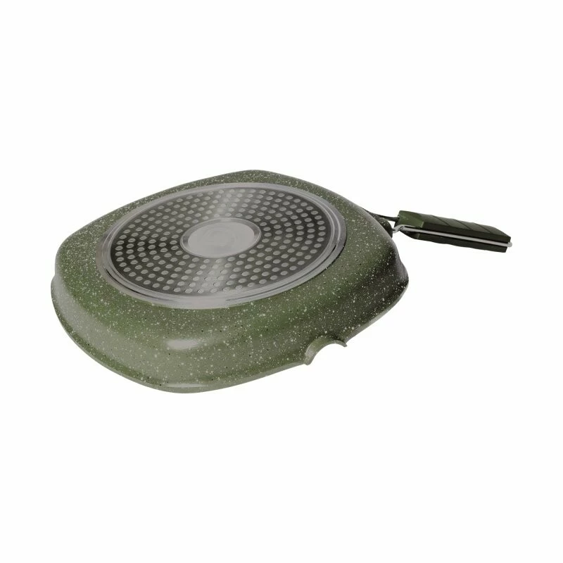 Pánev umožňuje vařit jídlo zdravěji díky sběrným kanálům pro odvod tuku. Základna pánve usnadňuje rovnoměrné rozložení tepla a speciální mramorovaný povlak zabraňuje přichytávání jídla, což umožňuje snadné čištění po vaření. Pánev má také skládací rukojeť pro snadnou přepravu.
