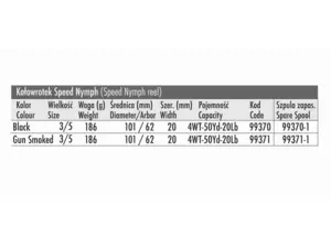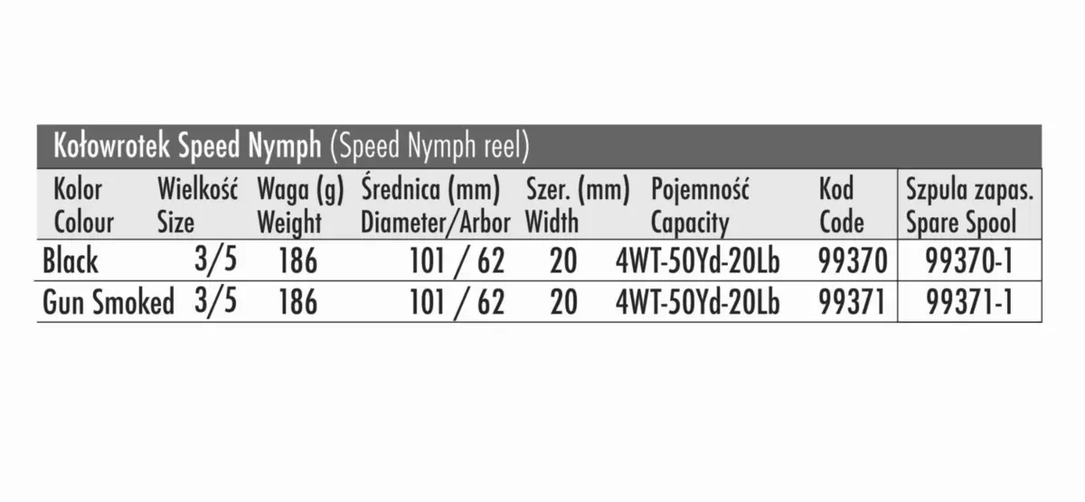 Kombinovaný naviják litý/CNC. Velký průměr navijáku s úzkou cívkou a velkým trnem umožňuje rychlé navíjení vlasce pro rychlejší rybolov. Extrémně přesná a plynulá brzda umožňuje použití tenkých délek háčků pro velké ryby. Pohodlné, ergonomické kolečko brzdy usnadňuje ovládání zdolávání ryb. Naviják Speed Nymph doporučujeme k delším Nymph prutům 10'6” a 11'0” #3 až #5.