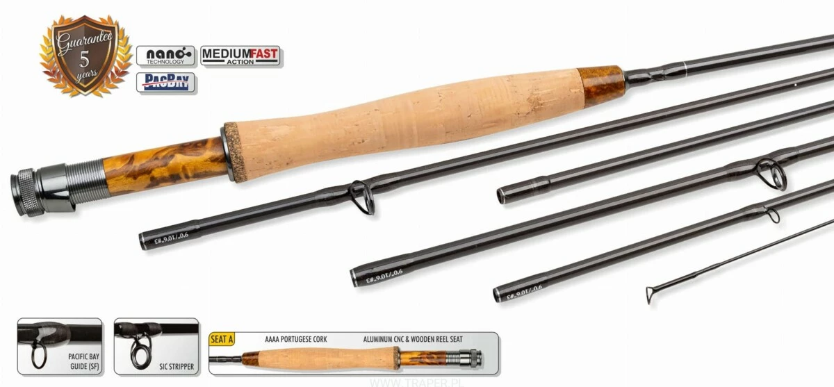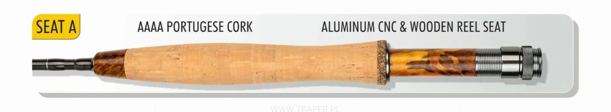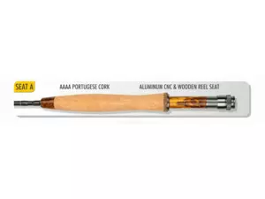 Svrchní část korku je zakončena exotickým dřevem a spodek směsí korku s gumou. Kovové sedlo navijáku je vyrobeno z hliníku CNC technologií. Sedlo je postaveno na dřevě s unikátními kroužky.