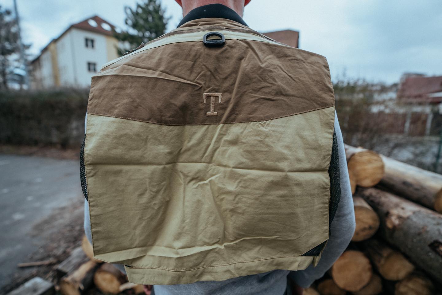 Vnitřek vesty je zakončen kruhovou síťovinou z polyesteru. Kapsy na návnadu a límec neoprenem.