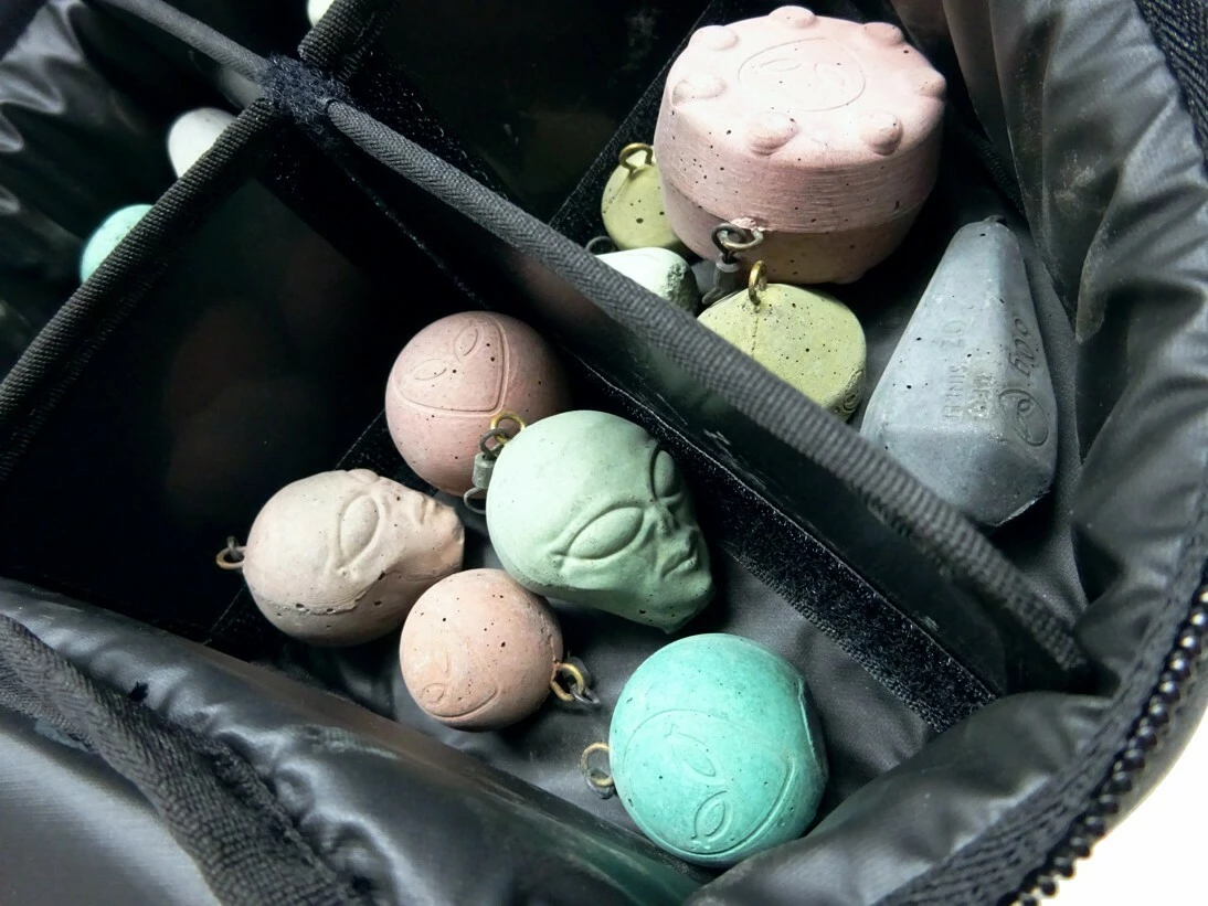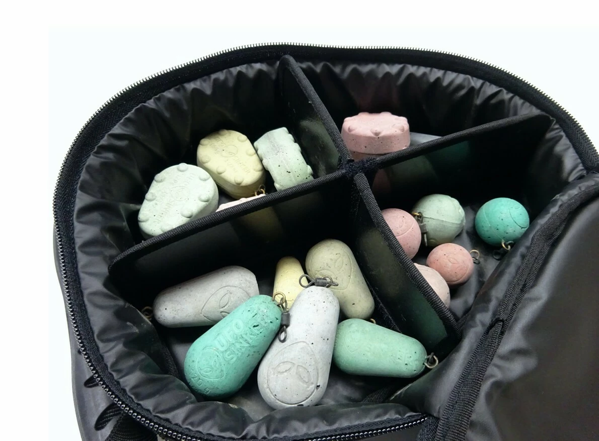 Odhozová taška "HLAVA" obsahuje originální komplet 20ks výběrových betonových zátěží v gramáži 80 - 100g, které se běžně využívají při tzv. odhozu, tedy lovu na kratší vzdálenosti. Naše zátěže neobsahují olovo, objemová hmotnost přesahuje 4g/cm3 díky použití přírodního magnetitu. Přirozenou vlastností betonu je jeho nasákavost, zátěže UFO SINKER ochotně nasáknou vaše oblíbená aromata. Uvnitř brašny se nacházejí 4 samostatné komory v nichž jsou uloženy tyto betonové zátěže podle jednotlivých druhů a gramáží. Přepážky mezi jednotlivými komorami jsou navíc pomocí suchých zipů oddělitelné, takže si můžete vnitřní podobu brašny uzpůsobit přesně na míru vašim aktuálním potřebám a doplňovat si postupně do brašny i další betonové zátěže jiných druhů. Při případné redukci vnitřních přepážek se poté úložná kapacita brašny ještě dále výrazně zvyšuje.