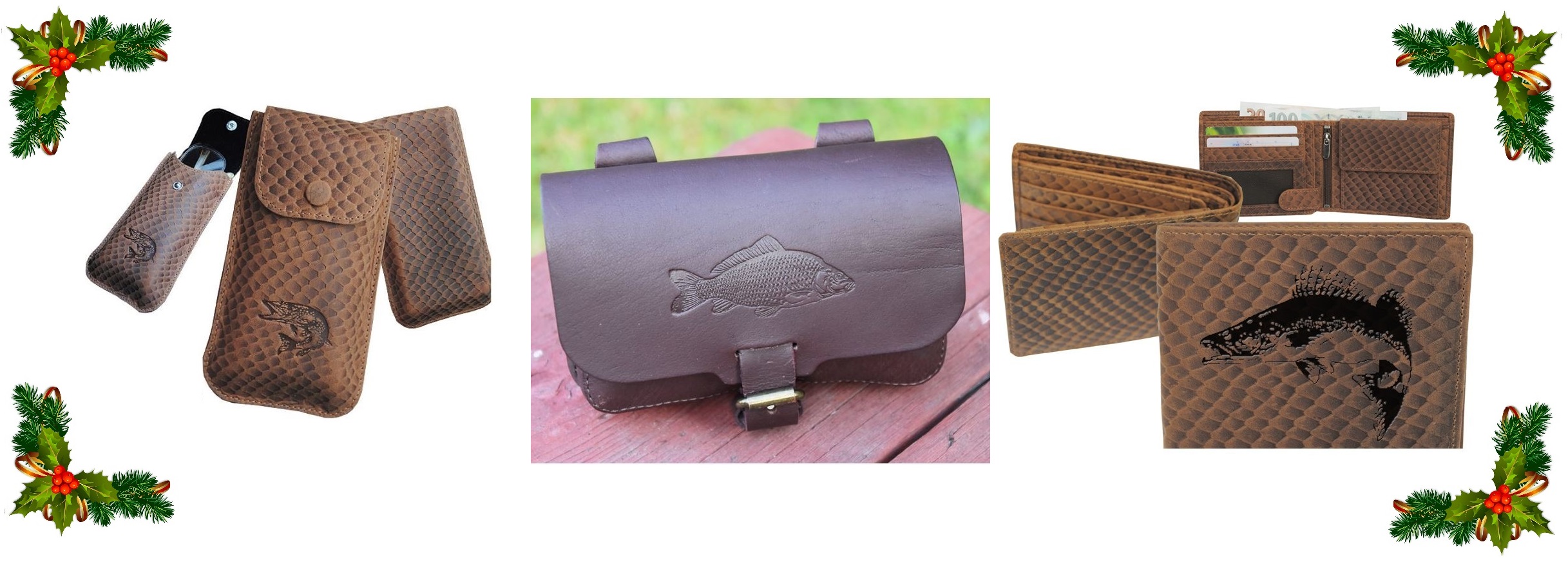 - Opravdu populární jsou dárky z kůže s rybářským motivem, jako jsou peněženky, opasky a nově pro letošní rok i Kožené kapsy na pásek a pouzdra na brýle či tabák.