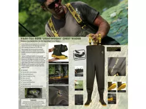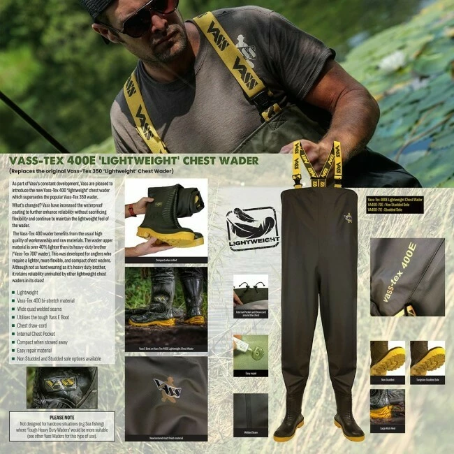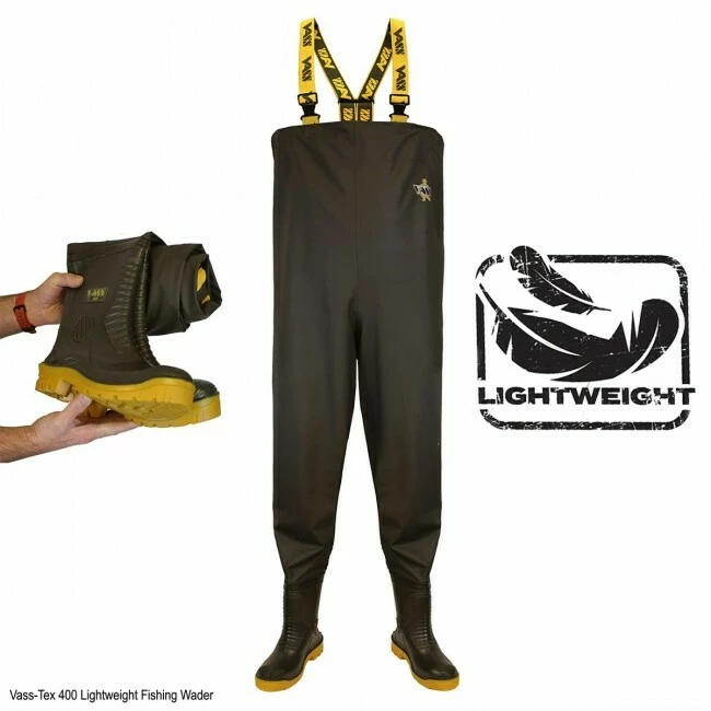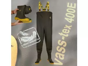 Prsačky VASS 400E Lightweight jsou nástupcem typu 350E. Byli vyvinuty pro ty rybáře, kteří vyžadují lehčí prsačky, aby minimalizovali svoji výbavu. Jsou téměř o polovinu lehčí než prsačky 700 E Nova Edition. Tento typ je z vyroben z vysoce kvalitního Vass-Tex 400 materiálu, který i když je lehčí, tak je dostatečně odolný. Ostatní prsačky jiných výrobců v této třídě se jim jen těžko budou rovnat. Není to jen obyčejný "kus hadru"! Čtyř vrstvé sváry, elastičnost, rychloupínací kšandy a také velmi jednoduchou opravitelnost.