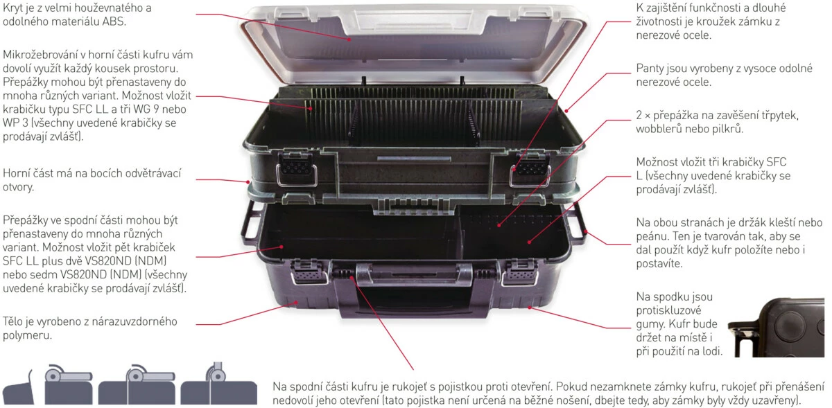 Na spodní části kufru je rukojeť s pojistkou proti otevření. Pokud nezamknete zámky kufru, rukojeť při přenášení nedovolí jeho otevření (tato pojistka není určená na běžné nošení, dbejte tedy, aby zámky byly vždy uzavřeny).
