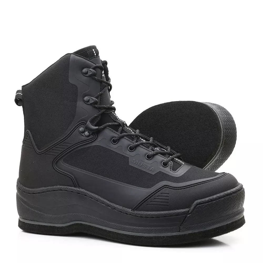 Potisk TPU v navržených oblastech poskytuje dobrou odolnost proti opotřebení, aniž by byla bota příliš objemná a těžká. Bota se snadno nazouvá a snadno se utahuje. Pro větší pevnost mají stehové linie vlastní drážky a mezipodešev EVA a přední nárazník podešve Michelin je přišitý ke svršku boty. Nyní jsme k botě Musta přidali klasickou plstěnou podrážku. Plstěná podrážka poskytuje extrémně dobrou přilnavost na mokrých říčních kamenech. Poradí si i s tenkou vrstvou řas a pokud to podmínky vyžadují, plstěnou podrážku lze snadno nacvaknout pomocí našich šroubovacích wolframových kolíků.