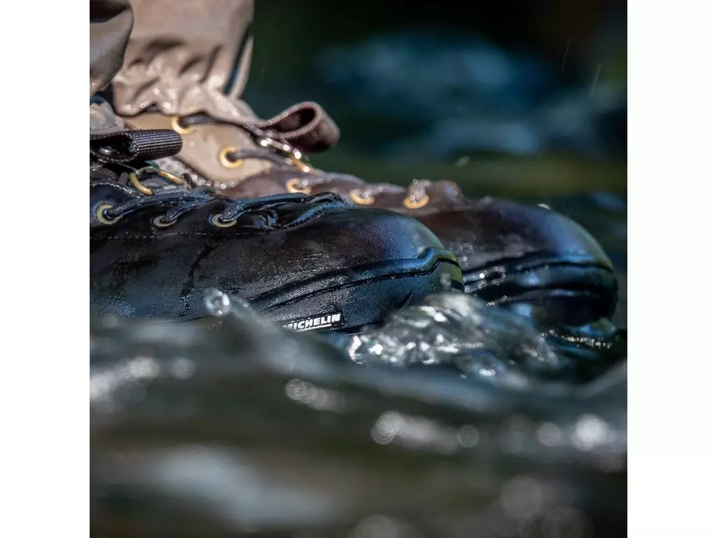Maximální pohodlí má nyní i maximální přilnavost. Dobře padnoucí kožená obuv, která nabízí skvělou oporu při brodění i chůzi, má nyní podrážku Michelin. Svršek je kombinací vodou ošetřené nubukové kůže, mikrovlákna a nylonové síťoviny. Tkaničky začínají daleko vpředu, což umožňuje botu dokonale utáhnout podle vlastního tvaru nohy. To spolu s vlastnostmi kůže dělá z těchto bot jednu z nejpohodlnějších brodících bot na trhu. Trojité a dvojité švy, prošitá a lepená mezipodešev a silný gumový nárazník, který je součástí podrážky, dělají z této boty super pevnou obuv.