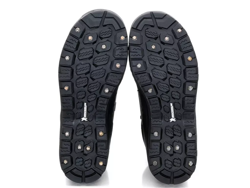 Podrážka Michelin, kterou jsme navrhli společně se světoznámým výrobcem pneumatik Michelin, nabízí oproti mnoha jiným gumovým podrážkám řadu výhod. Přední nárazník je zabudován do podrážky, takže neexistuje možnost jejich oddělení. Vzorek podrážky je inspirován pneumatikou Michelin LTX A/S s úpravami zaměřenými na brodění. Výstupky na bocích mají agresivní plastiku, která poskytuje extra přilnavost na svazích a blátivých cestách. Uprostřed mají výstupky vlnovité lamely pro přilnavost a přizpůsobivost na nerovném povrchu skal. Přední a patní plastiky jsou navrženy tak, aby snesly opotřebení při delších procházkách, a jejich vzorek dodává trakci, když je potřeba. Pro extrémně kluzké a slizké podmínky jsme vytvořili prohloubené pozice pro naše hroty z karbidu wolframu, které lze v případě potřeby přidat.