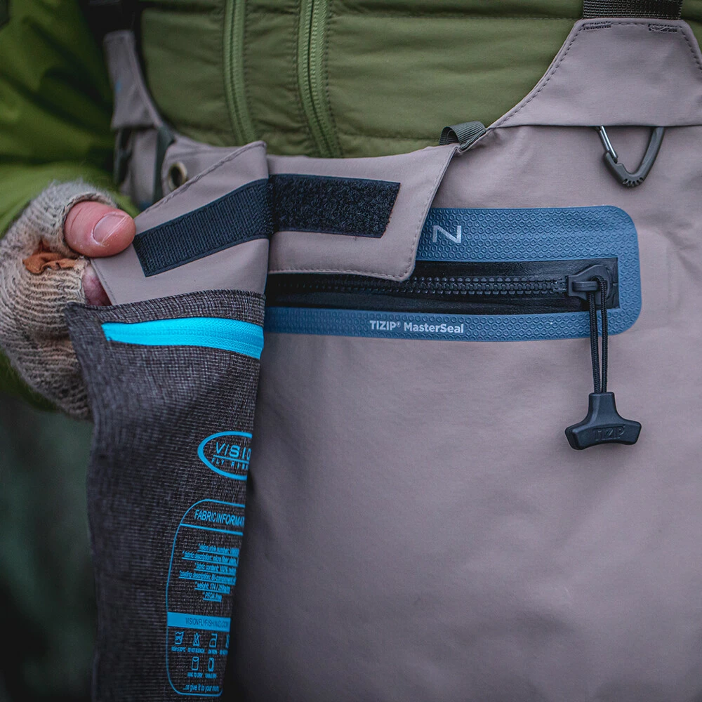 - Plně vodotěsná náprsní kapsa se zipem YKK AquaSeal nebo TiZip Master Seal 6
