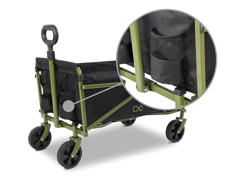 K vysoce praktickému využití vozíku přispívají také dva držáky na láhev či jiné příslušenství, které jsou umístěny na přední straně. Další výhodou je poutko umístěné na dně úložného prostoru, které zjednoduší skládání vozíku. Pro pohodlný transport vozíku ve složeném stavu jsou na obou stranách přišity úchyty.