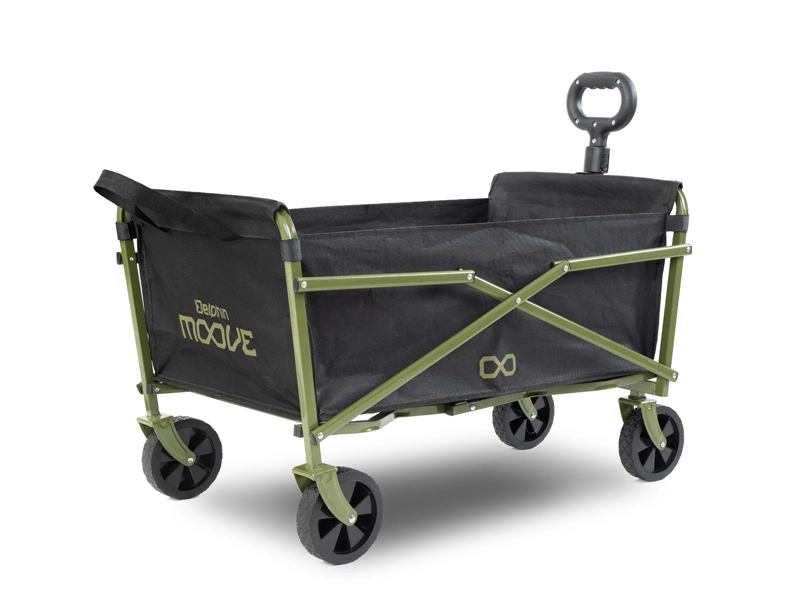 Vozík Delphin MOOVE se pohybuje díky 4 pevným, plastovým kolečkům. Přední kolečka jsou otočná, což zaručuje snadnou manipulaci a rychlou změnu směru. Jejich velkou výhodou je odolnost vůči vnějším vlivům a nulová pravděpodobnost propíchnutí. Celou konstrukci doplňuje teleskopická rukojeť s plastovým úchytem. Tlačítko umístěné na rukojeti umožní složení rukojeti na přepravní rozměr, přičemž k upevnění slouží plastový držák, do kterého rukojeť jednoduše zacvaknete.