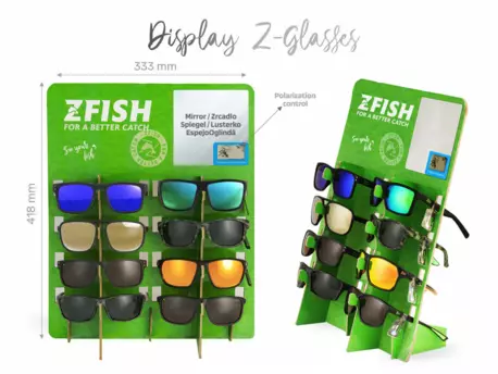 Ideální pomocník pro dokonalou prezentaci našich nových vyladěných brýlí. Kvalita materiálu a zpracování tohoto stojanu spolu s elegantním zeleným ZFISH designem zajistí, že se na Vaší prodejně rozhodně neztratí a jsme si jistí, že neunikne pozornosti žádného zákazníka. Součástí displeje je zrcadlo a samolepka s testem polarizace.
