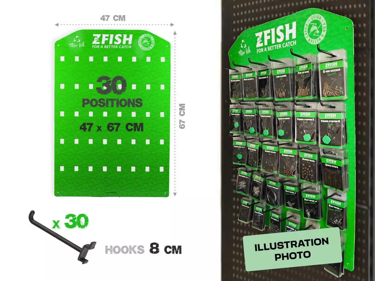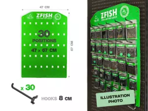 Ideálním pomocník pro dokonalou prezentaci našich nových vymazlených produktů prémiové řady "3FISH". Kvalita materiálu a zpracování těchto plat spolu s elegantním černo-zeleným ZFISH designem zajistí, že se na Vaší prodejně rozhodně neztratí a jsme si jistí, že neunikne pozornosti žádného zákazníka. Plato disponuje velkou plochou k zavěšení produktů na prodejní háčky. Součástí balení těchto ZFISH plat jsou samozřejmě i samotné závěsné háčky a to v počtu 30 ks