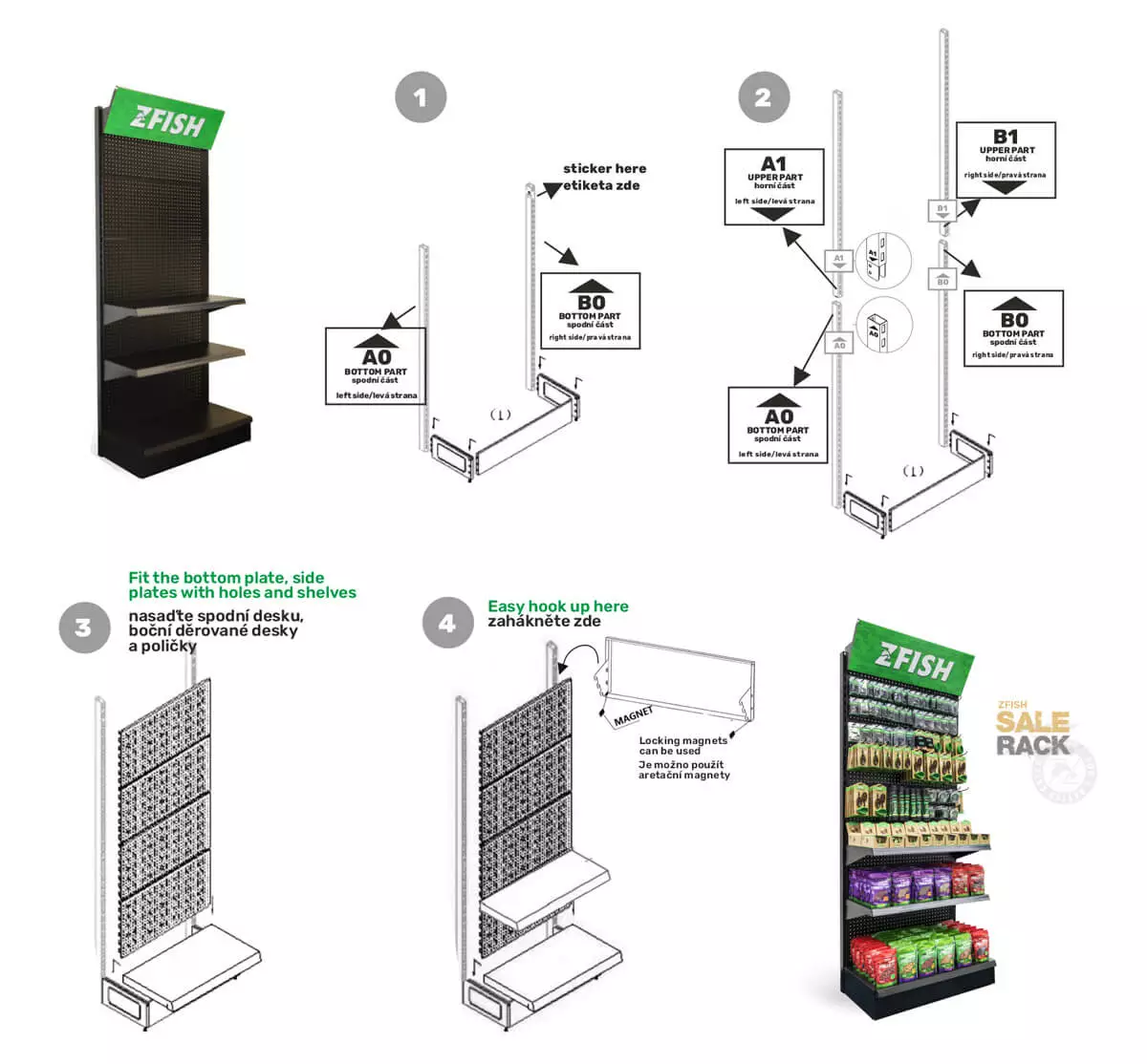 ZFISH Stojan Sales Rack je pevný a stabilní prodejní regál, který je ideálním pomocníkem pro naprosto dokonalou prezentaci našich nových vymazlených produktů prémiové řady "3FISH". Nekompromisní kvalita materiálu a zpracování těchto stojanů spolu s elegantním černo-zeleným ZFISH designem zajistí, že se na Vaší prodejně rozhodně neztratí a jsme si jistí, že neunikne pozornosti žádného zákazníka. Regál disponuje velkou děrovanou plochou k zavěšení produktů na klasické prodejní háčky, a je dále opatřen dvěmi libovolně umístitelnými policemi a i samotná podstava tvoří polici a umožňuje vystavit další produkty. Součástí balení těchto ZFISH regálu jsou samozřejmě i samotné závěsné háčky. Stojany jsou samozřejmě navržené a vyrobené tak, aby šli snadno propojit a seskládat vedle sebe.