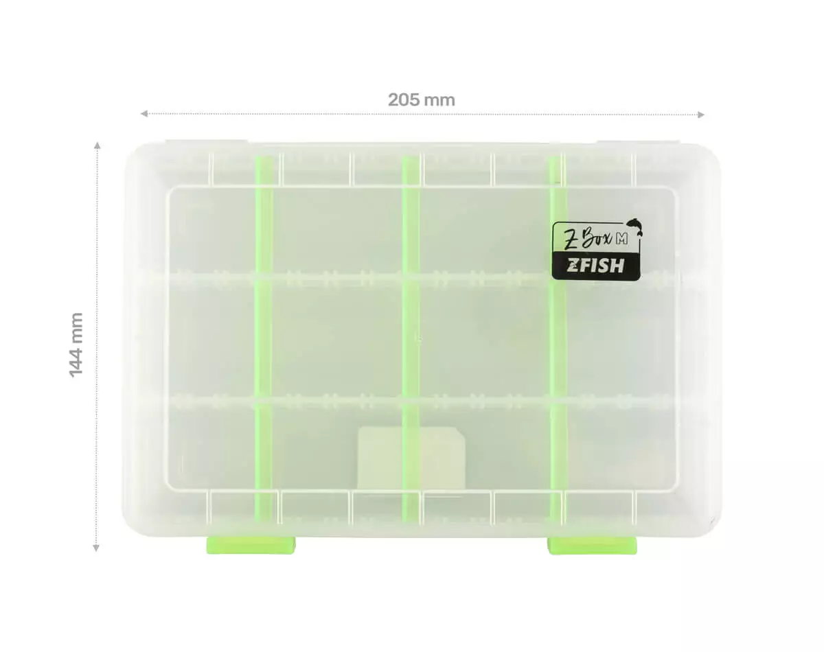 ZFISH Krabička Z-Box M je klasická, univerzální, průhledná krabička/tackle box od české značky ZFISH. Tento organizér disponuje dostatečným prostorem a přihrádky si přizpůsobíte dle potřeby pomocí vyjímatelných přepážek. Bezpečné uzavírání, nebo nechtěné otevření zajišťují dva zavírací klipy.